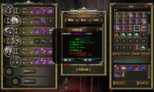 分化背包中不需要的装备可得到精魄石,在抽奖的时候,我们难免会获得一些等级很低的装备,既然用不到,不如分化它来得到一些精魄石和金钱,用以成就其他的装备。分化可选择免费或花费10通宝,花费通宝可在分化时额外获得更多精魄石。